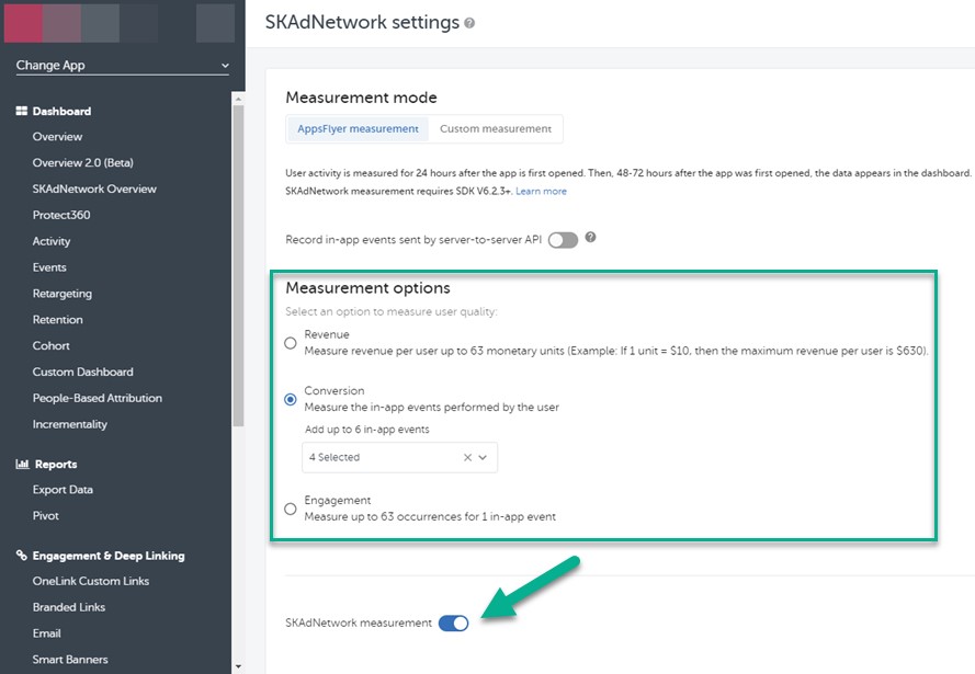 - עלינו לבחור את ההמרה המתאימה על גבי פלטפורמת ה-SKAdNetwork (נעשה באופן חד פעמי) ולהפעיל את מדידת ה-SKAdNetwork