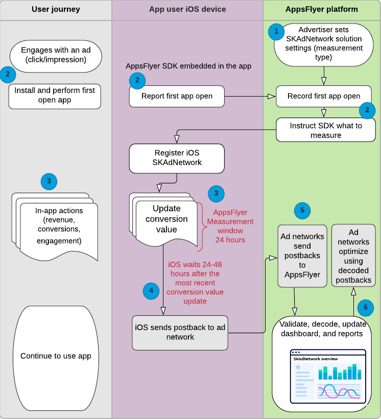התרשים לקוח מאתר Appsflyer https://support.appsflyer.com/hc/en-us/articles/360011420698-SKAdNetwork-Solution-guide#solution-principles-and-flow